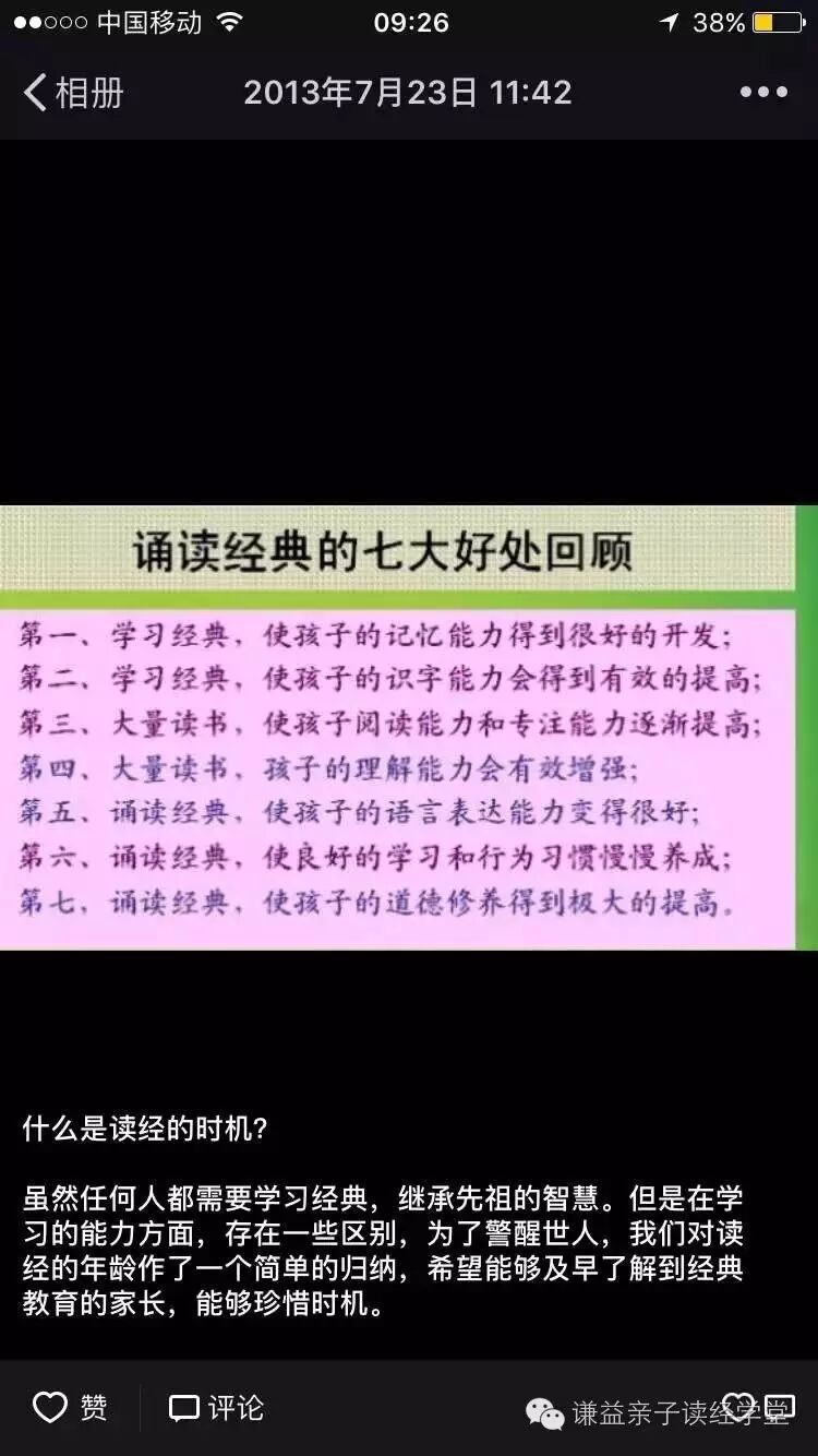 上海爱读经胎教院,每个月都会有二天的胎早教周末公益学习班,欢迎有缘的朋友来学习。具体学习的信息,定期会在“谦益亲子读经学堂”公众号公布。也可以加上海爱读经胎教院,微信号:13641771489。了解详情。王财贵教授说: 在我倡导的“儿童读经教育”理念中最为重要也是首开的教育原则是:教育的时机要把握。我希望天下父母都能把握教育的第一原则,若加上适当的教材及有效的教法,则每个家庭都可以期待教养出清明、光辉、饱满的孩子。