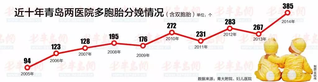 根据青大附院提供的一组过去十年的统计数据,记者发现,在该院出生的多胞胎婴儿中,多胞胎的单次生育个体总量呈上升趋势,在2005年、2006年多胞胎数量是20多个,而到了2008年多胞胎数量已达到了50多个,以后每年都超过60多个,其中去年就有102个多胞胎,平均每3到4天就有一个多胞胎出生。