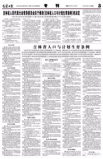 (2002年9月27日吉林省第九届人民代表大会常务委员会第三十二次会议通过根据2004年6月18日吉林省第十届人民代表大会常务委员会第十一次会议《吉林省人民代表大会常务委员会关于废止和修改部分地方性法规的决定》修改2011年7月28日吉林省第十一届人民代表大会常务委员会第二十七次会议修订根据2014年3月28日吉林省第十二届人民代表大会常务委员会第七次会议《吉林省人民代表大会常务委员会关于修改〈吉林省人口与计划生育条例〉的决定》修正根据2016年3月30日吉林省第十二届人民代表大会常务委员会第二十六次会议《吉林省人民代表大会常务委员会关于修改〈吉林省人口与计划生育条例〉的决定》修正)