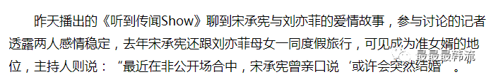 其实韩媒之所以给刘亦菲盖章怀孕,除了上面几条“证据”之外,还有着天仙男票宋承宪的自曝。
