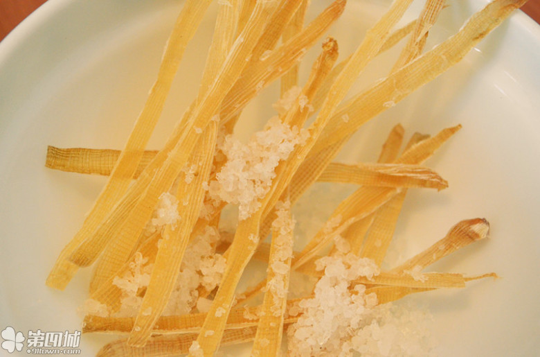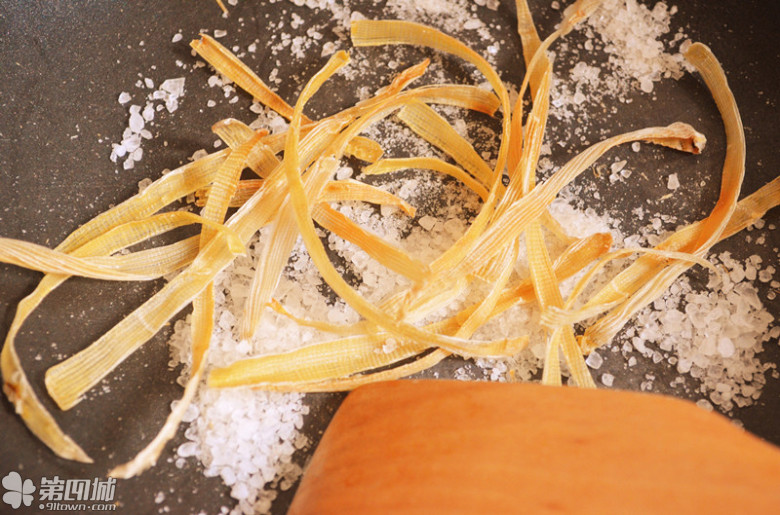 放入盐,不要油,炒至金黄色,我用的是海盐;