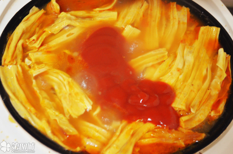 加入汤,西红柿酱,我和老公都喜欢吃腐竹,放了很多。