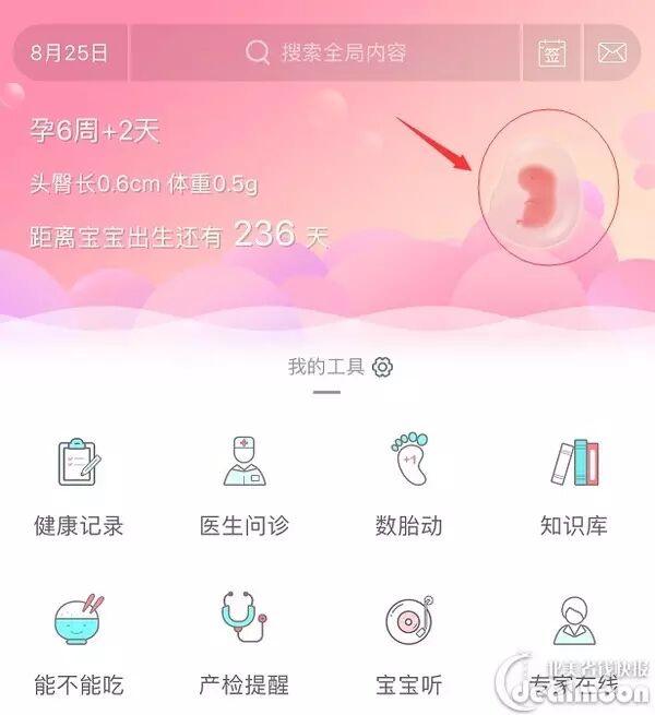 大家可以很清楚的看到今天是你怀孕的第几周第几天,同时在页面的右上方有这胎宝宝的样子,点击这个胎宝宝,你会发现近日胎宝宝的动态是什么样子的。