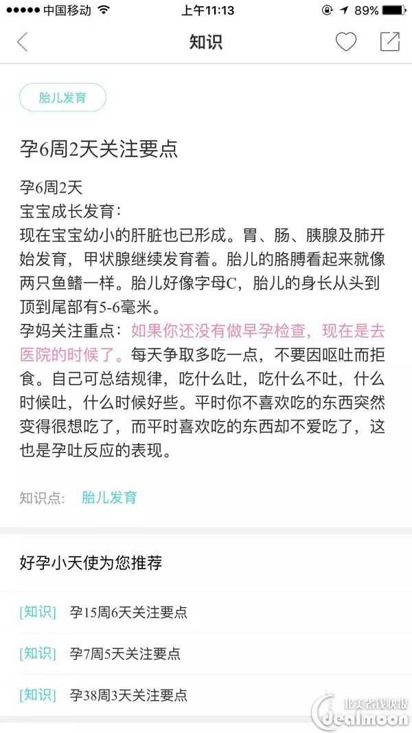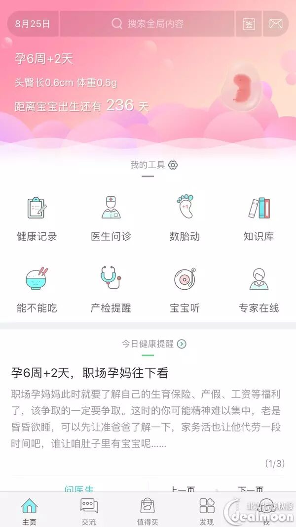 每一天都会告知你今天宝宝的成长状态,大小和什么地方正在发育,不仅科普了知识,也让妈妈更加安心。每天都会查看这里关注着宝宝的动态,没有医生你也可以很清楚状况,是不是非常酷?另外你还可以看到许多知识库,每天都会有3条tips告诉你这一周该注意什么。还有产检提醒功能。