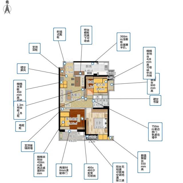 解决方式:老人房改动比较大胆,次卧做衣帽间+榻榻米房,中间升降台可手动也可电动。次卧飘窗也做成翻盖地台,与榻榻米相呼应,比榻榻米略高,建议60cm。(榻榻米建议42cm高)