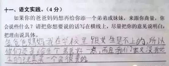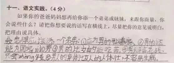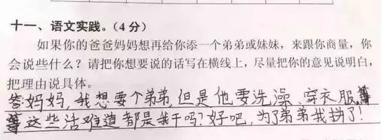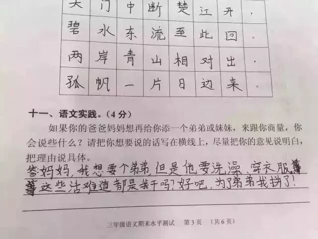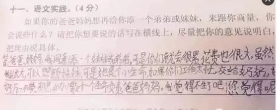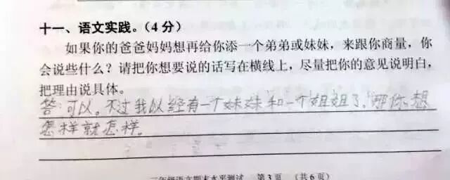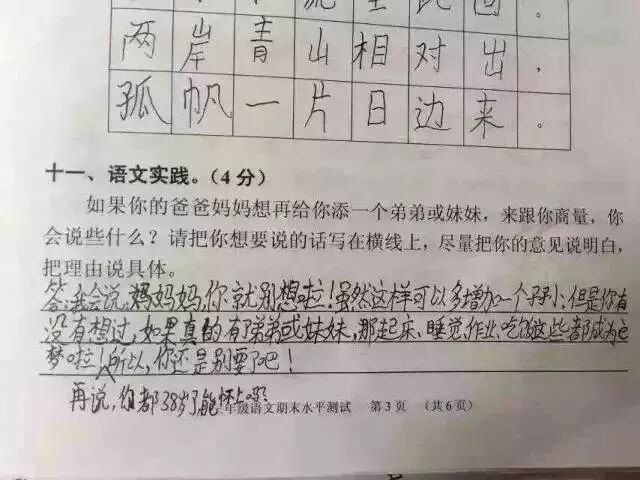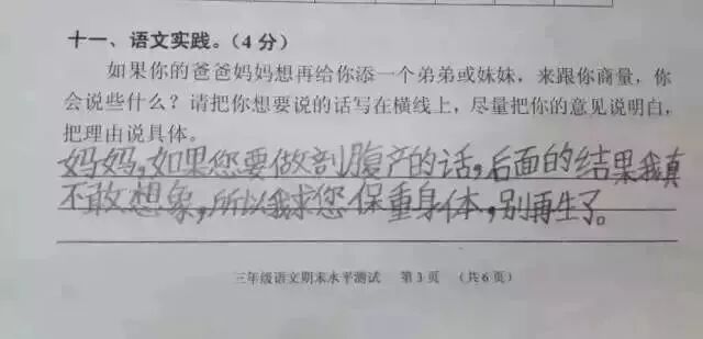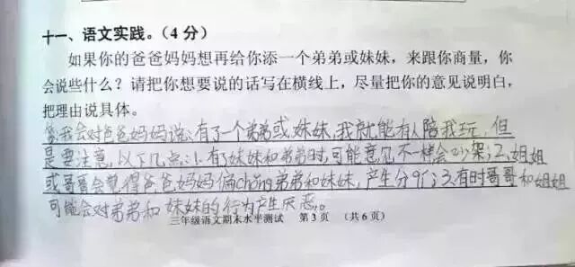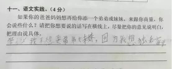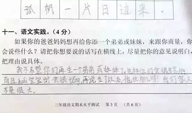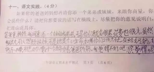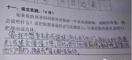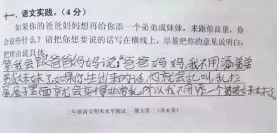 广州某区三年级语文考试题与时俱进地考起了二胎政策。三年级小学生的答案让人笑趴了,求爸爸妈妈看到卷子之后的心理阴影面积!