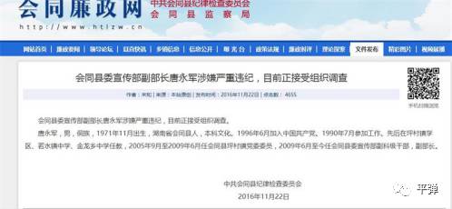 该通报内容显示,生于1971年出生的唐永军,系湖南省会同县人。1990年7月参加工作。先后在坪村镇学区、若水镇中学、金龙乡中学任教,2005年9月至2009年6月任会同县坪村镇党委委员,2009年6月至今任会同县委宣传部副科级干部,副部长。