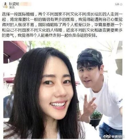 韩国演员秋瓷炫和于晓光两人2015年9月公开恋情,2017年1月18日领证。