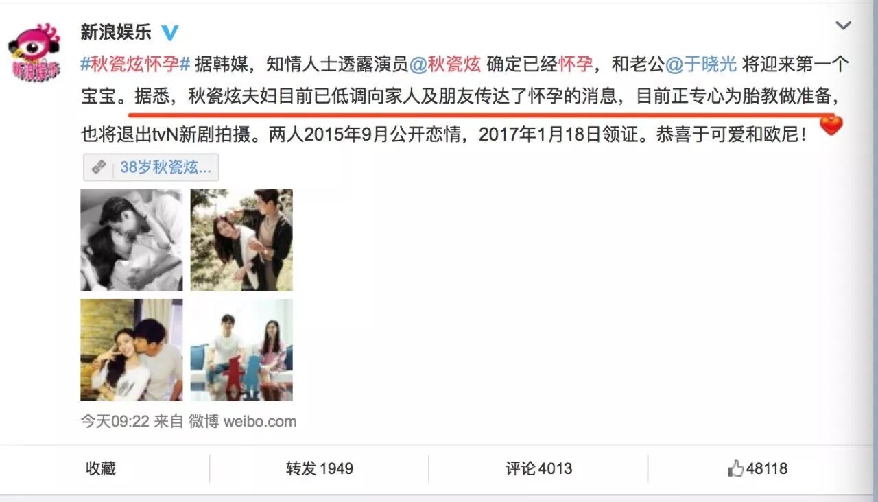 这两天叨爷收到一个好消息,韩国知名演员也是中国媳妇秋瓷炫怀孕啦!