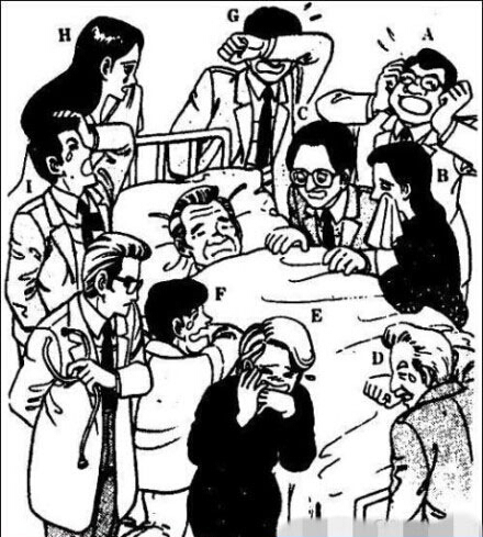 亲朋好友正守护的是某大企业董事长,拥有万贯家产的高城幸之助。他不知遭什么人的枪击,此刻刚刚停止了呼吸。那么,请仔细看下图。在场的人中,只有一个人对董事长的死幸灾乐祸。请你注意每个人的表情,并以此为线索,找一找这个人是谁,罪犯也肯定是这个人。