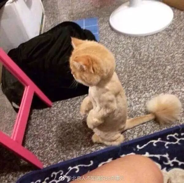 一只猫咪被主人剃毛后,生无可恋的在镜子旁呆了一个小时。