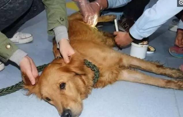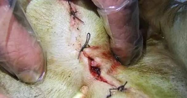 网友既伤心又愤怒,此时的狗狗已经无法站立,他赶紧把狗狗送到医院,医生在查看狗狗伤口时很震惊,缝合的针线十分杂乱,而且也并非专用的!