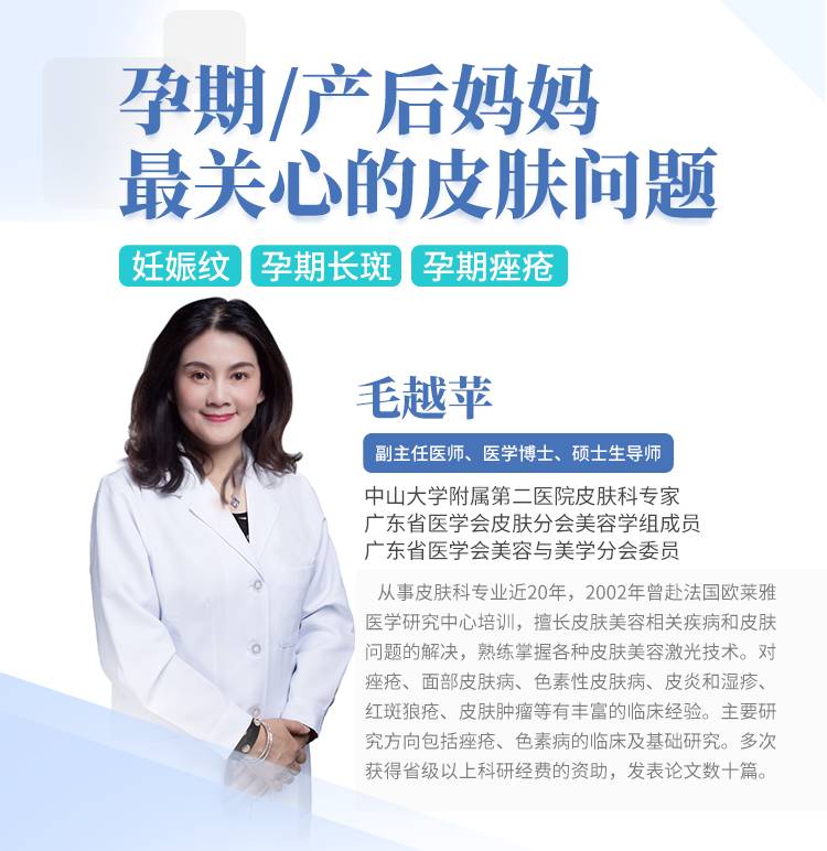 孕期、产后妈妈皮肤比较敏感,容易受刺激,那么遇到黄褐斑、痤疮、妊娠纹等皮肤问题,应该怎么解决呢?近日,爱博恩综合门诊特邀中山二院皮肤科专家毛越苹主任,在线为3百余名孕妈妈/妈妈们讲解孕期、产后妈妈常见皮肤问题,并在线与孕妈妈/妈妈们互动,解答大家的担心与疑惑。