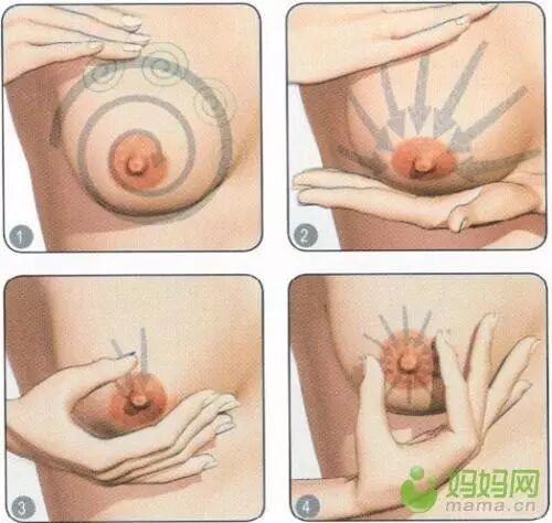 孕期适时进行乳房按摩,每天一到两次,一次数分钟,可以在每天沐浴的时候进行:将乳晕向乳房四周的方向分别向下推压。到怀孕第九个月的时候,每天做促使乳腺畅通的按摩,将乳房用拇指食指扶住,轻轻推压,能使乳腺畅通。