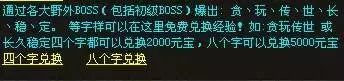 精心设置爆率,【贪玩传世长久稳定】八个字可谓价值千金!让小BOSS也能爆出大惊喜!最高5000元宝(折合RMB2500元整!)奖励。值得一提的是,即便完成四个字即可兑换!再也不是一定集满才可兑现啦!