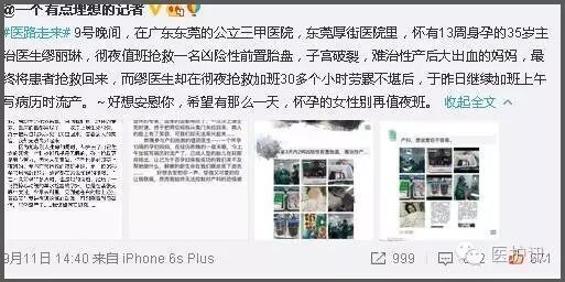 新浪微博@一个有点理想的记者发送了一则令人悲伤的消息:9号晚间,在广东东莞的公立三甲医院,东莞厚街医院里,怀有13周身孕的35岁主治医生缪丽琳,彻夜值班抢救一名凶险性前置胎盘,子宫破裂,难治性产后大出血的妈妈,最终将患者抢救回来,而缪医生却在彻夜抢救加班30多个小时劳累不堪后,于昨日继续加班上午写病历时流产。