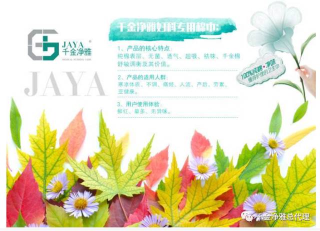 欢迎加入千金净雅大家庭,V信号kanshu68主要产品:千金净雅妇科专用卫生棉、千金净雅产妇包,产品特点:100%纯棉、0真菌0细菌(药械级别的卫生标准)、预防妇科疾病发病率、行气化瘀。我们有最优秀的团队,最专业的培训,期待你的加入。