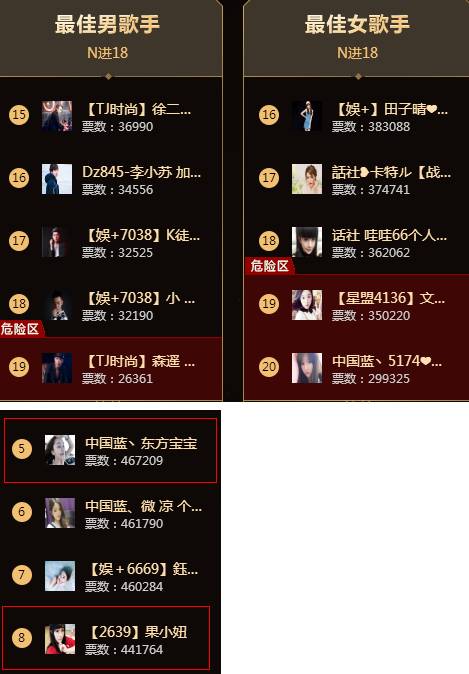 男歌手很平静直至结束!但是女歌手在最后时刻,可谓是最激烈的一组!最后10分钟,果小妞、东方宝宝二人奋起直追,秒上前十!最终,文徒小肥肥及中国蓝晴儿遗憾出局!35W票的出局...