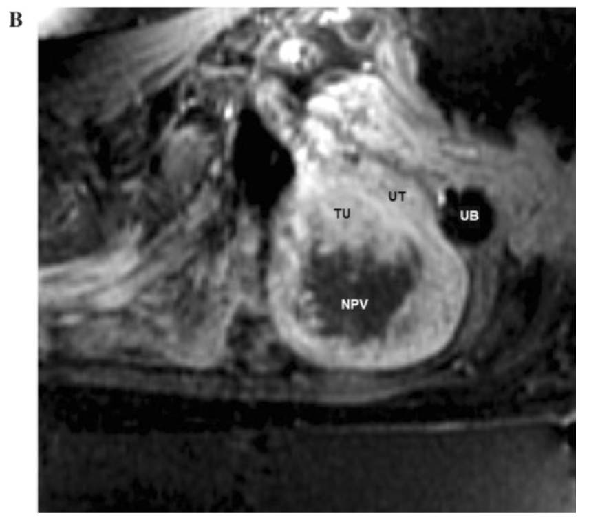 A:治疗前的核磁共振显像,TU:子宫腺肌症病灶