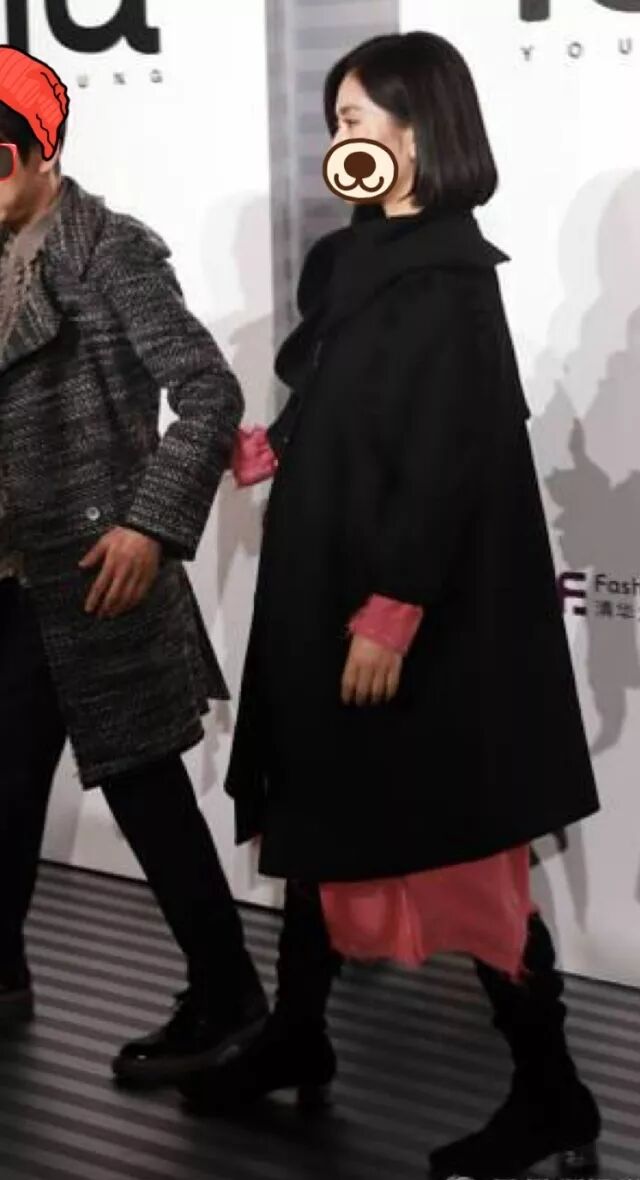 穿着黑色长外套,桃红长裙。