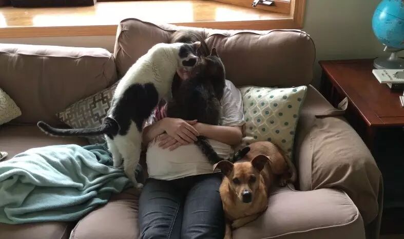 Cory是一位准妈妈,她的宝宝下个月就要诞生了。但截止到现在,她并没有因为怀孕而抛弃家里的一只汪和两只喵。