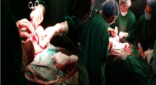 住院后超声明确完全性胎盘植入,患者有出血现象并逐渐增多,最后经患者及家属同意终止妊娠,考虑到患者还年轻有生育要求,同时摘除子宫对她心灵会受到很大的创伤,因此我们进行多科合作治疗前置胎盘:双侧子宫动脉栓塞术加暂时性阻断腹主动脉剖宫产术。