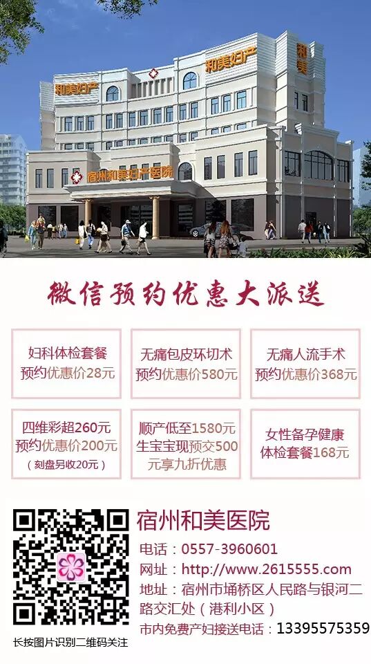 “宿州和美医院”贴心提示:如果您有相关妇科健康的疑问,可直接通过点击“阅读原文”,您也可以通过拨打我们的免费咨询预约热线:0557-3960601,或咨询QQ: 952225555,在线专家24小时为您服务。由于近期来诊人数剧增,请您在网上提前预约挂号,网络预约,无需排队,享受绿色通道。
