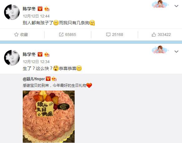 网友也纷纷在第一时间送来祝福,颖儿好友陈学冬也转发微博惊讶送祝福:“生了?这么快?恭喜恭喜!”,又接着发文说:“别人都有孩子了,而我只有几条狗…” 陈学冬这是来搞笑的吗,哈哈哈...