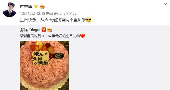 12月12日正是颖儿的29岁生日,当天12点12分的时候,颖儿发文庆祝并向大家公布了自己怀孕的喜讯:“感谢宝贝的到来,今年最好的生日礼物”。随后付辛博也转发博文,庆祝“有两个宝贝”的美事,坐实两人将迎来爱情的结晶。
