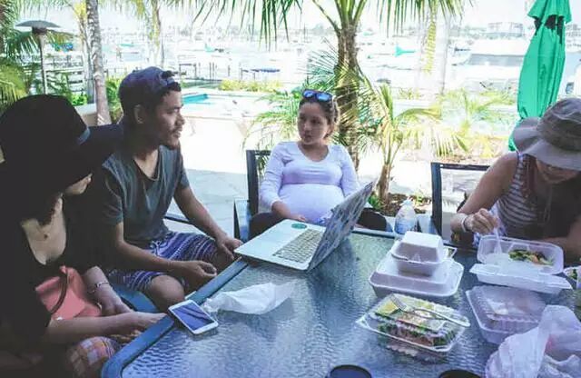 怀孕的时候,得要两个人搀着走!可看样子还是挺开心的!