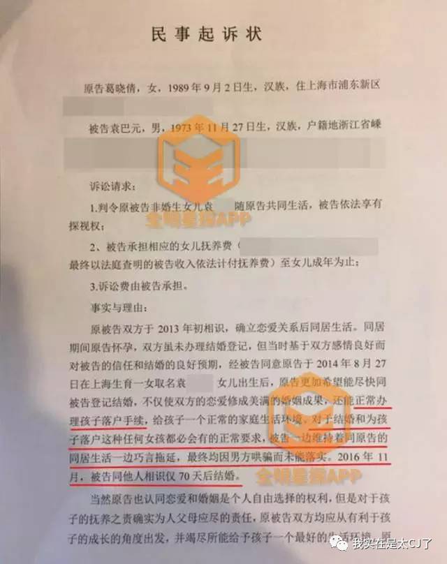 直到5月那次爆料,知情人透露,葛晓倩已于2017年1月5日,将袁巴元告上了法庭,并附上诉讼状。