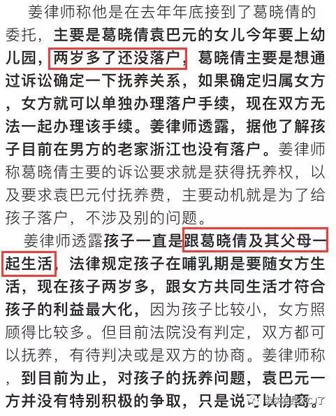 不仅如此,张雨绮说孩子由自己和袁巴元一起抚养,但律师却表示孩子一直在和葛晓倩生活在一起。