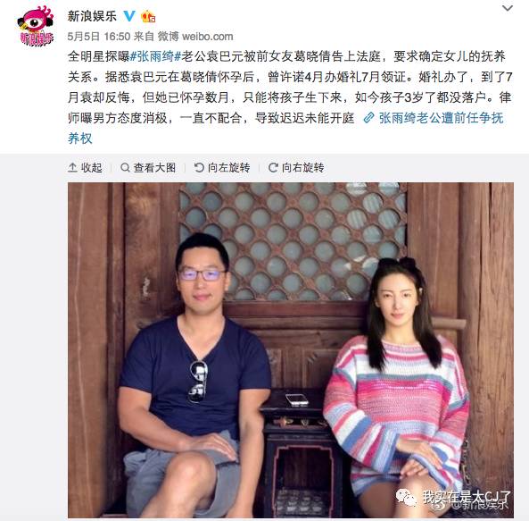 因为5月初的时候,张雨绮的老公袁巴元被爆料,遭到前女友葛晓倩的诉讼上告,要求确定两人女儿的抚养关系。