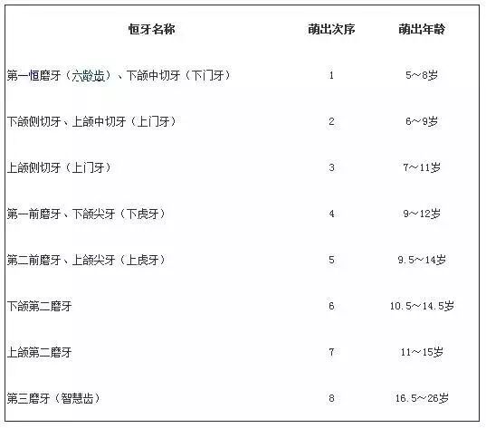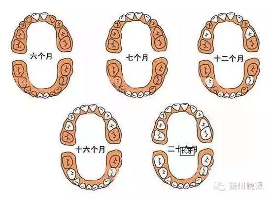 乳牙萌出的时间和顺序 1、中切牙:下颌6个月;上颌7个半月 2、侧切牙:下颌7个月;上颌9个月 3、第一乳磨牙:下颌12个月;上颌14个月 4、犬牙:下颌16个月;上颌18个月 5、第二乳磨牙:下颌20个月;上颌2岁 有的孩子会有个别牙齿的萌出顺序颠倒,但最终并不影响牙齿的排列,无需处理