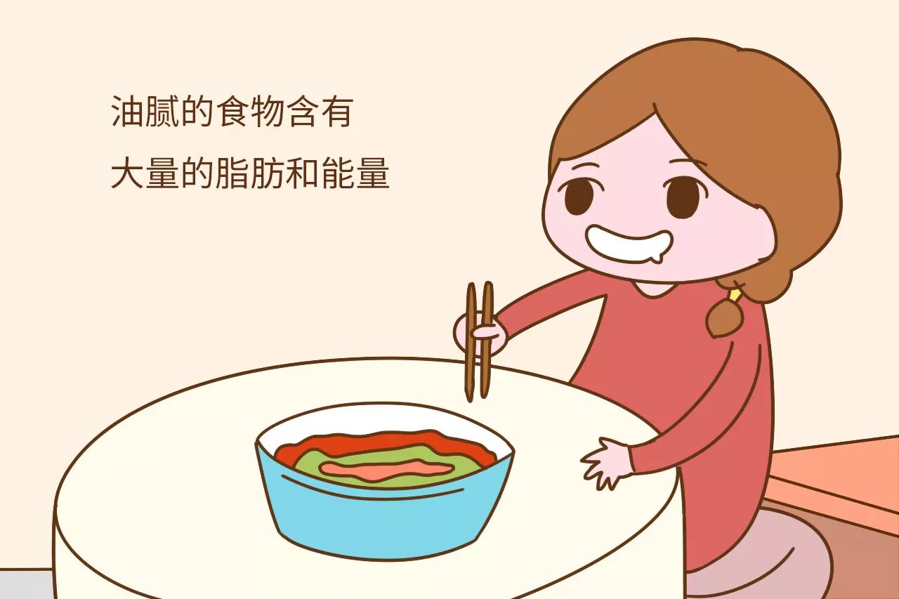 怀孕后孕妈最不缺的是营养,家里的各种鱼肉从来没断过。晚上饿醒了顺便再拿出油腻食物补补。可是油腻的食物含有大量的脂肪和能量,不仅难消化,容易变胖,而且还可能让孕妈保持长时间的高血糖状态。对孕妈的健康有很大的损害。