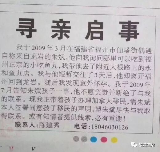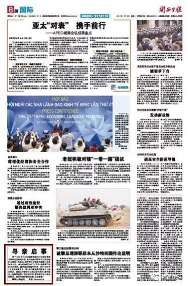 这篇启事刊登在闽西日报第8版国际版上。