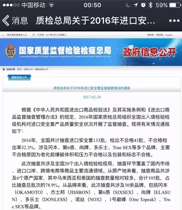 2月20日,国家质检总局官网通报,去年总局组织全国出入境检验检疫机构对进口安全套进行抽检,总计抽检133批,检出不合格产品43批,不合格检出率32.3%,检出的不合格项目包括老化前爆破体积、压力不合格等。