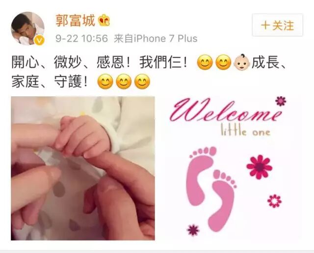 9月22日,郭富城方媛夫妇以及董子健孙怡夫妇晒出一家三口的拉手照,首度公开家庭新成员的到来。