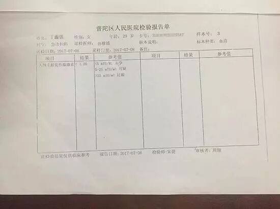 民警随后带李玲玲到普陀区人民医院进行检查。医院检查结果显示:李玲玲的人绒毛膜促性腺激素数值小于1.2mIU/ml,她并未怀孕。