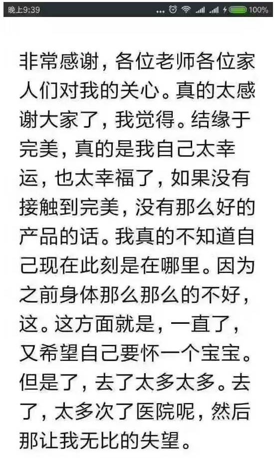 不可思议!朋友们!你是否还记得三月份来长沙做分享的那个芳芳?刚刚收到好消息,结婚八年因子宫肌瘤八年做了三次手术,后来又长四个,无法受孕的芳芳,有缘接触到完美的产品,通过冯老师给她沟通了十五分钟的健康观念用上清调补三个月后子宫肌瘤掉了三个,还有一个变小了,五个多月后的今天怀孕了,恭喜芳芳这个消息发出来,群里所有的人都沸腾了,所有在场听到这个消息的人都流着感动的泪水恭喜芳芳有了完美的宝宝,从此幸福围绕终身!……感恩我们伟大的完美公司感恩清调补,也感谢她自己简单的相信,证据的力量。