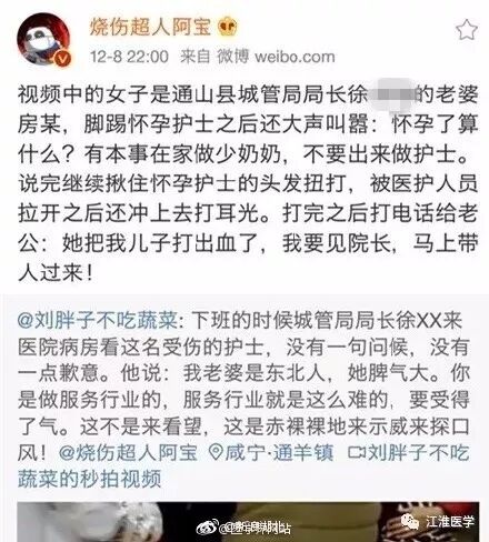 但另据网友爆料:房女士丈夫为湖北咸宁通山县城管局徐局长。当时该局长来到医院病房,看到这名受伤的护士说道:“我老婆是东北人,她脾气大。你是做服务行业的,服务行业就是这么难的,要受得了气”。(具体详情,还有待警方核实,以警方、通山县委宣传部通报为准。若有最新消息,我们将在留言处及时更新说明)