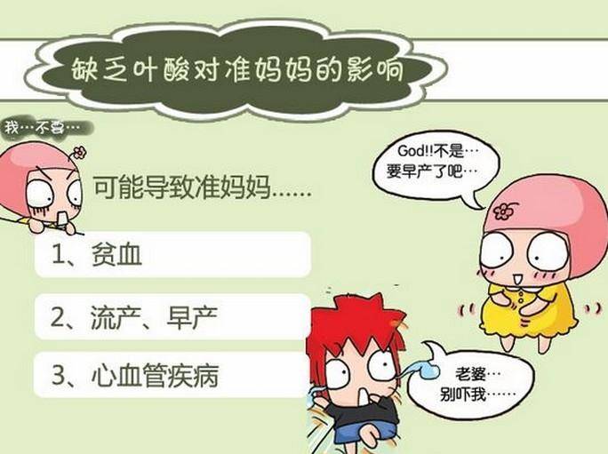 孕妇对叶酸的需求量比正常人高4倍,叶酸缺乏可导致胎儿畸形、胎儿神经管发育缺陷,增加无脑儿、脊柱裂、早期自然流产、新生儿体重过轻、早产以及婴儿腭裂(兔唇)等的发生率。