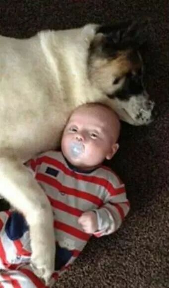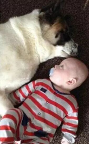 现在,狗狗已经化身宝宝的24小时狗保母,一刻也不舍得把视线离开小主人!