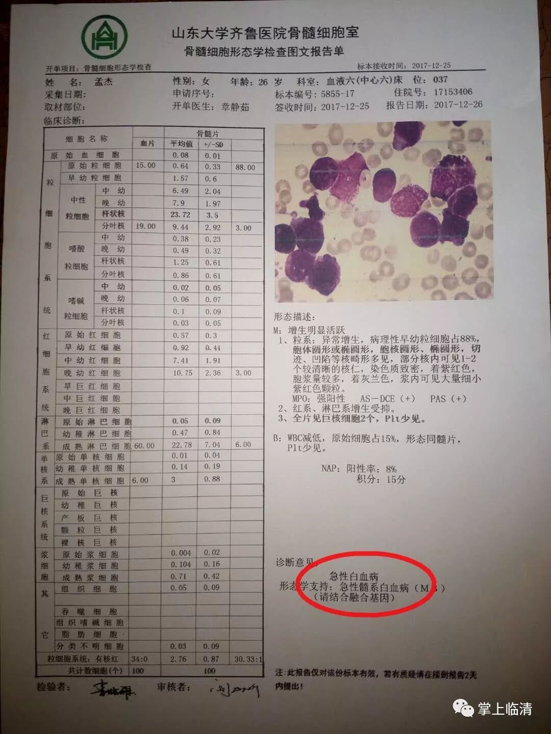 刘桂林讲述妻子确诊过程:“11月份牙龈发炎,当时没有重视,就以为是怀孕期间导致智齿发炎,12月11号在聊城二院常规孕检时发现白细胞非常低,医生初步诊断白细胞减少症。为进一步确定病情,14号在山东省中医院做了骨穿,检查结果显示为急性髓系白血病。”
