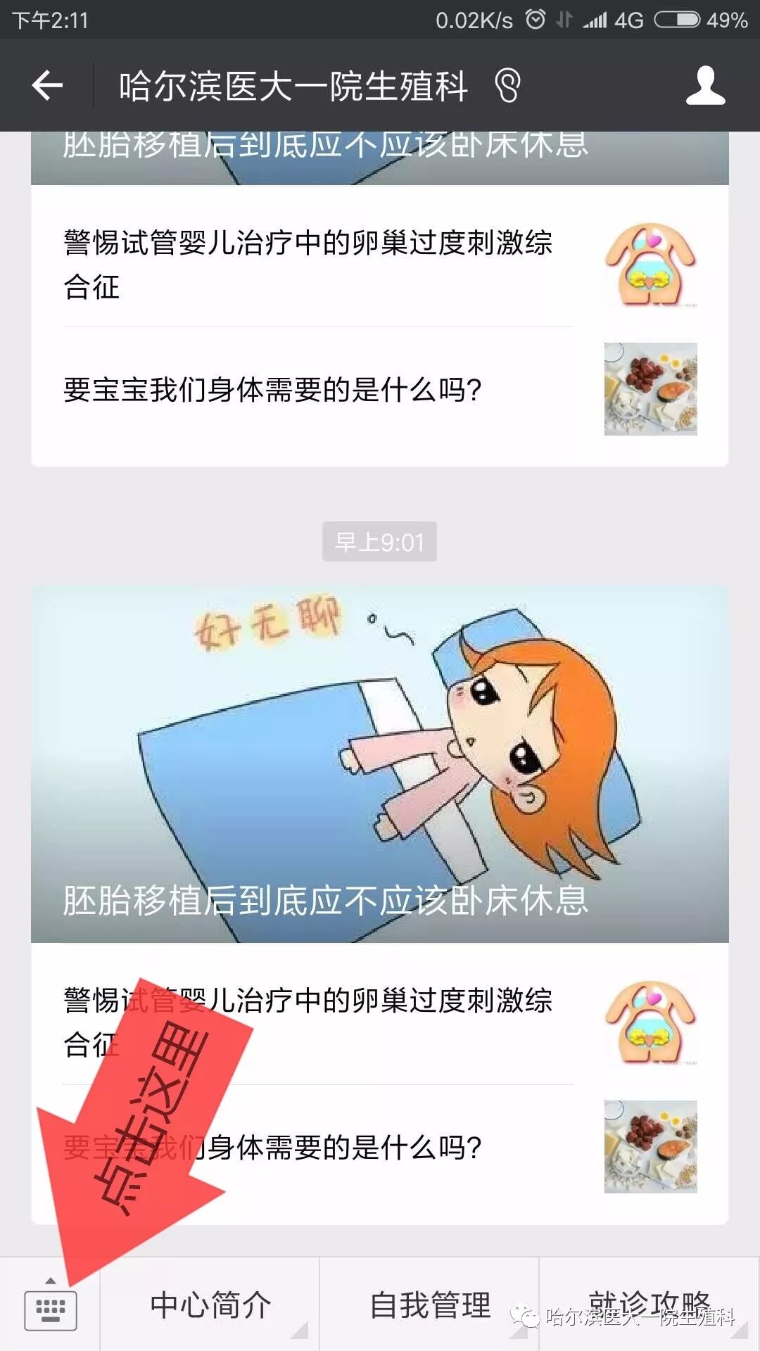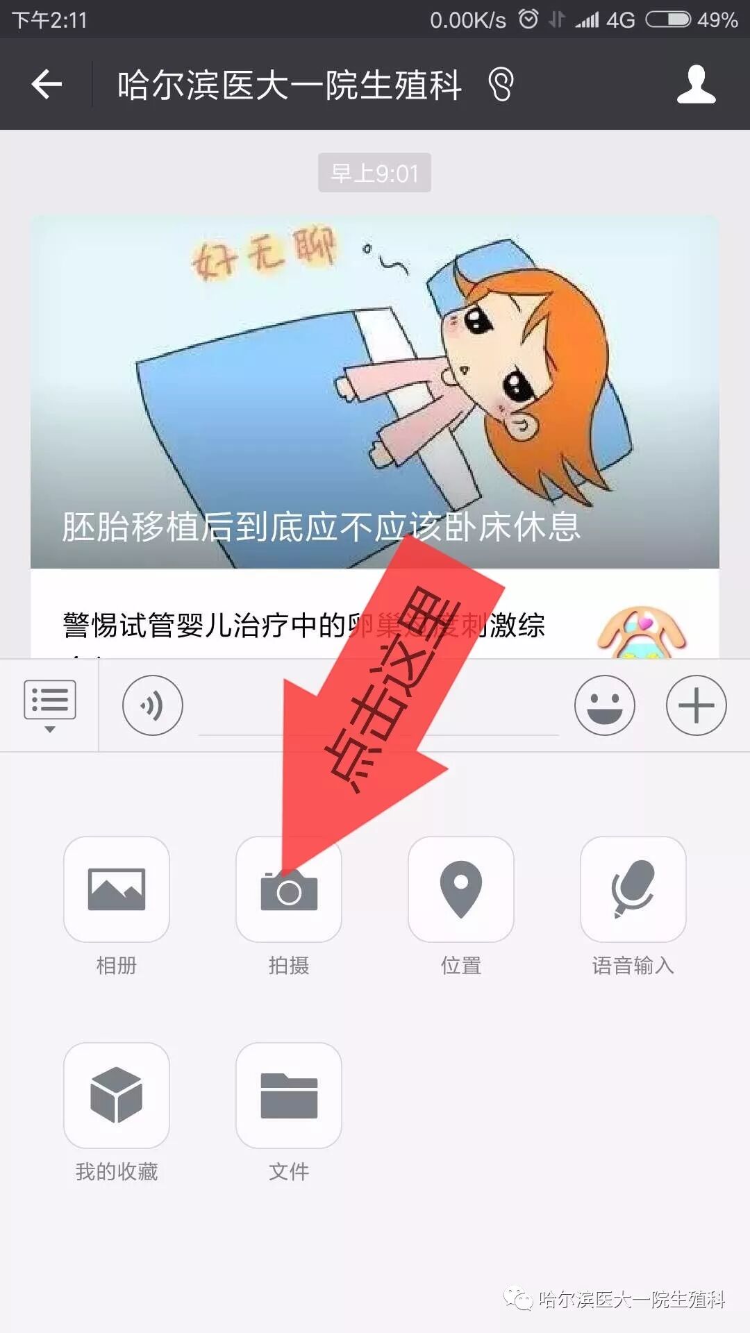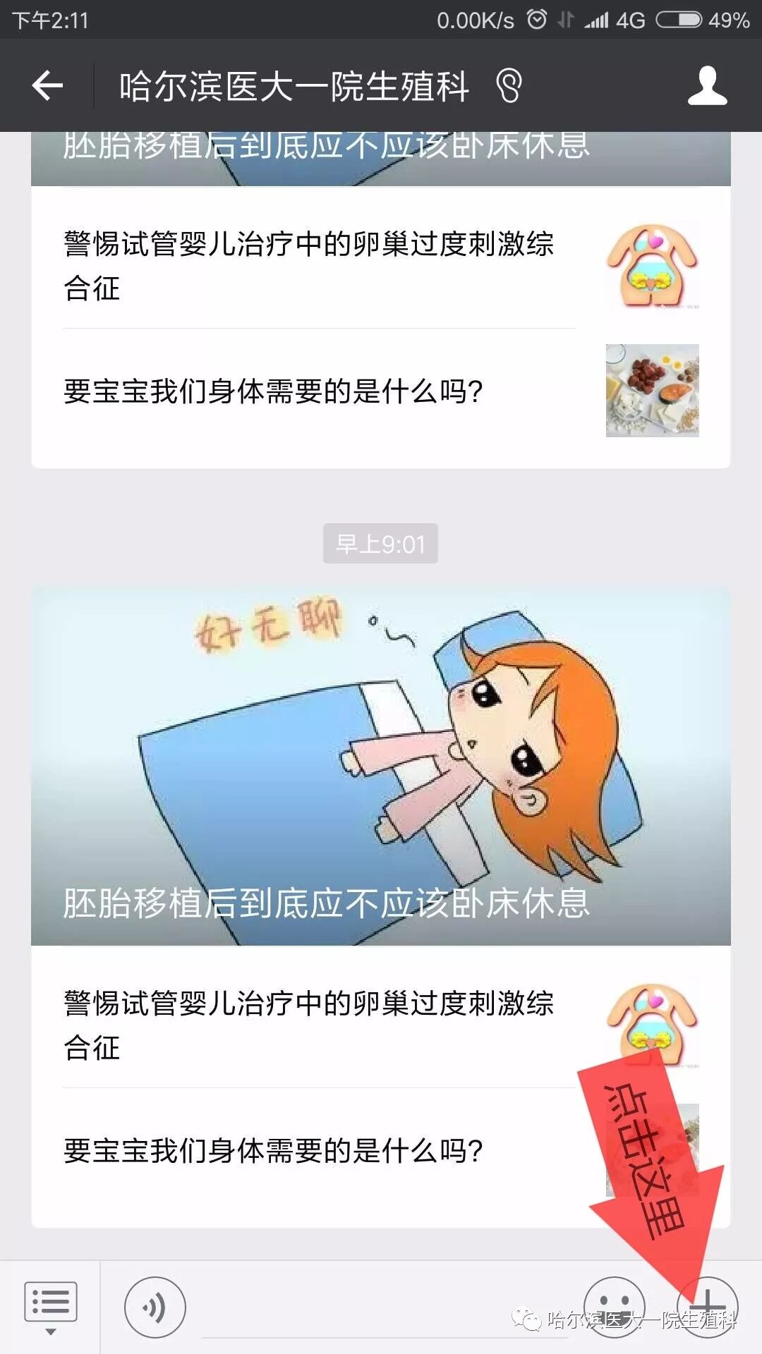 试管婴儿移植成功受孕的患者须将怀孕7周及12周彩超报告单复印件交给医院,因公众号具有上传照片功能进和高像素拍照手机的普及,为提升患者就以便捷性,减少患者往返医院次数,现开放公众号回传怀孕彩超报告单功能,接受时间为法定工作日的周一至周四,具体方法如下