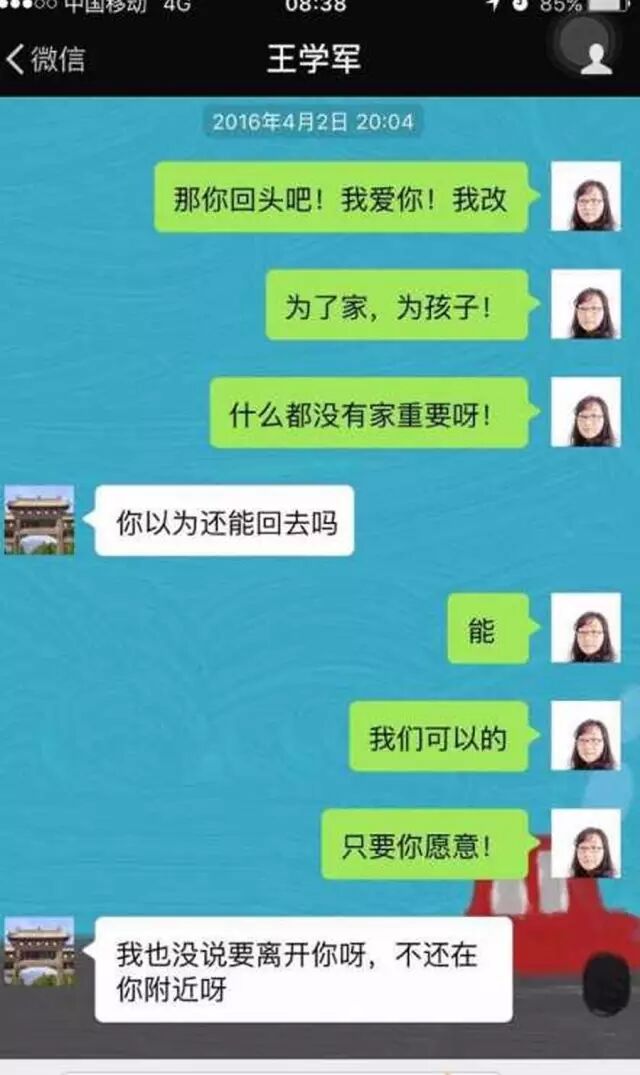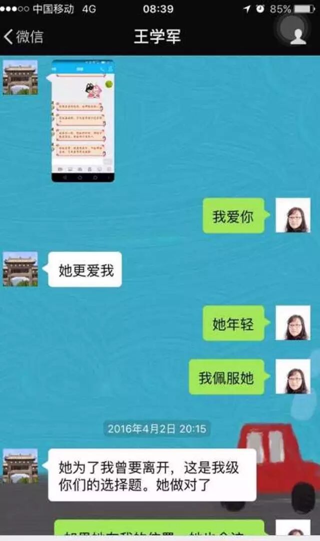 “那你回头吧,为了家,为了孩子,什么都比家重要”、“你以为我还能回去吗”、“我爱你”、“她更爱我”,这是王学军妻子与其在微信上的对话,王学军妻子说,在手机上,刘芳也曾告诉她“我为什么不能见阳光”、“有人爱我不愿离开”等等。王学军妻子说,她为了自己的声誉,也为了给她与孩子一个公正的待遇,她决定实名举报丈夫包养曾经教过的女生并致其怀孕的事实。