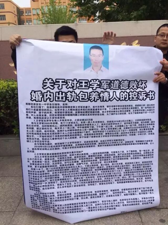 “在职教师王学军伤风败俗婚内出轨包养学生”,9日上午,在位于淮安市解放西路上的淮安市第一中学门口,当老师与学生准备进校园时,发现校园门口有人拉着写有此话的横幅,旁边还有一份王学军妻子打印好的数千字控诉书。
