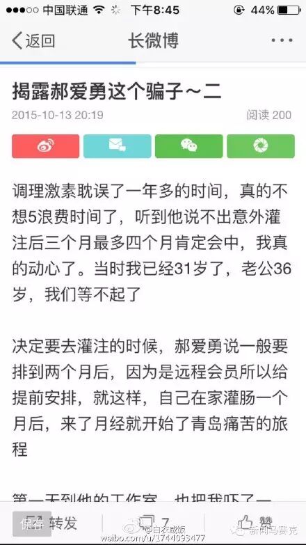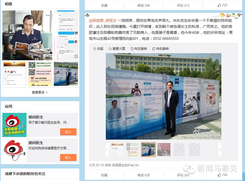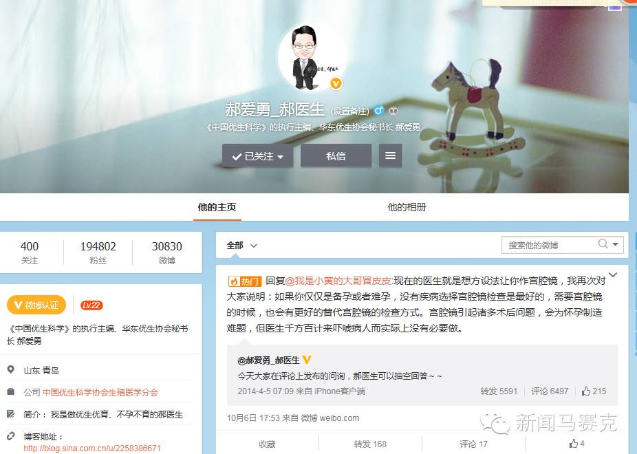 今天,认证为“泌尿外科执业医师”的@成都下水道转发该微博,并直指当事医生就是认证为“《中国优生科学》的执行主编、华东优生协会秘书长”的郝爱勇。