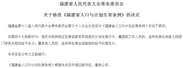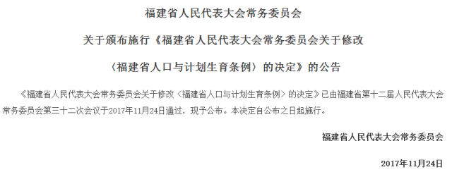 《福建省人民代表大会常务委员会关于修改〈福建省人口与计划生育条例〉的决定》已由福建省第十二届人民代表大会常务委员会第三十二次会议于2017年11月24日通过。修改后的《福建省人口与计划生育条例》12月6日正式公布,并自公布之日起施行。