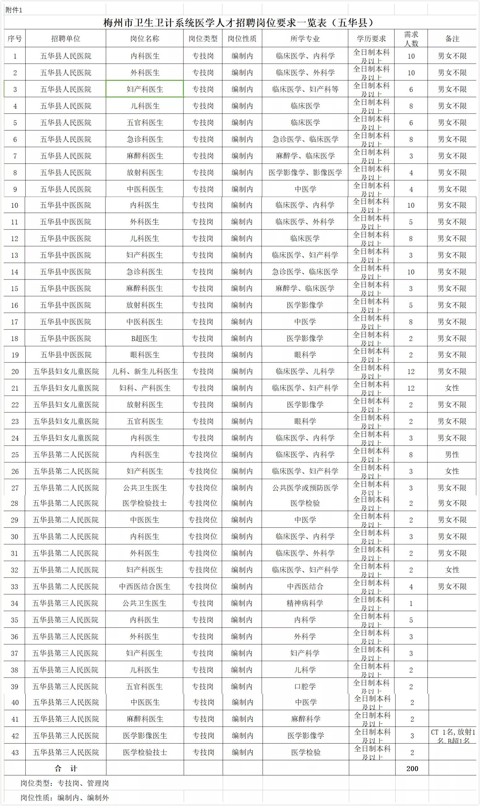 四、详细招聘计划见附件1《梅州市卫生卫计系统医学人才招聘岗位要求一览表(五华县)》